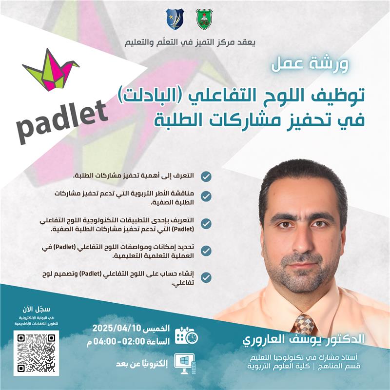 يقدم الورشة د. يوسف العاروري | أستاذ مشارك في تكنولوجيا التعليم | قسم المناهج | كلية العلوم التربوية.