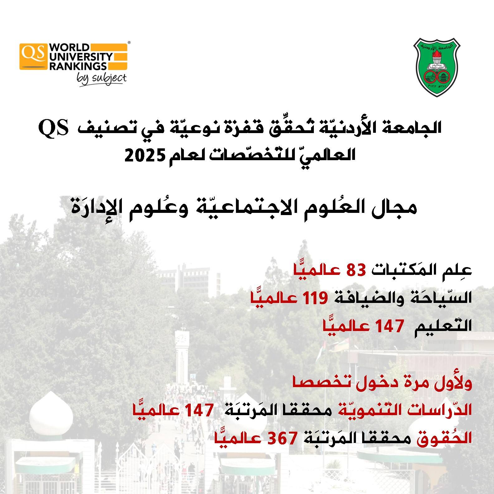 يبارك الدكتور محمد المعاقبة أستاذ القانون العام المشارك/ كلية الحقوق ومدير مركز الاستشارات والتدريب للجامعة الأم جامعتنا الأردنية عقل الدولة وبيت الخبرة ودرة التاج العلمي الأردني الإنجاز العالمي الجديد بإدراج كلية الحقوق العتيدة ضمن قائمة أفضل ٤٠٠ كلية قانون في العالم وفق تصنيف QS العالمي للتخصصات ٢٠٢٥.