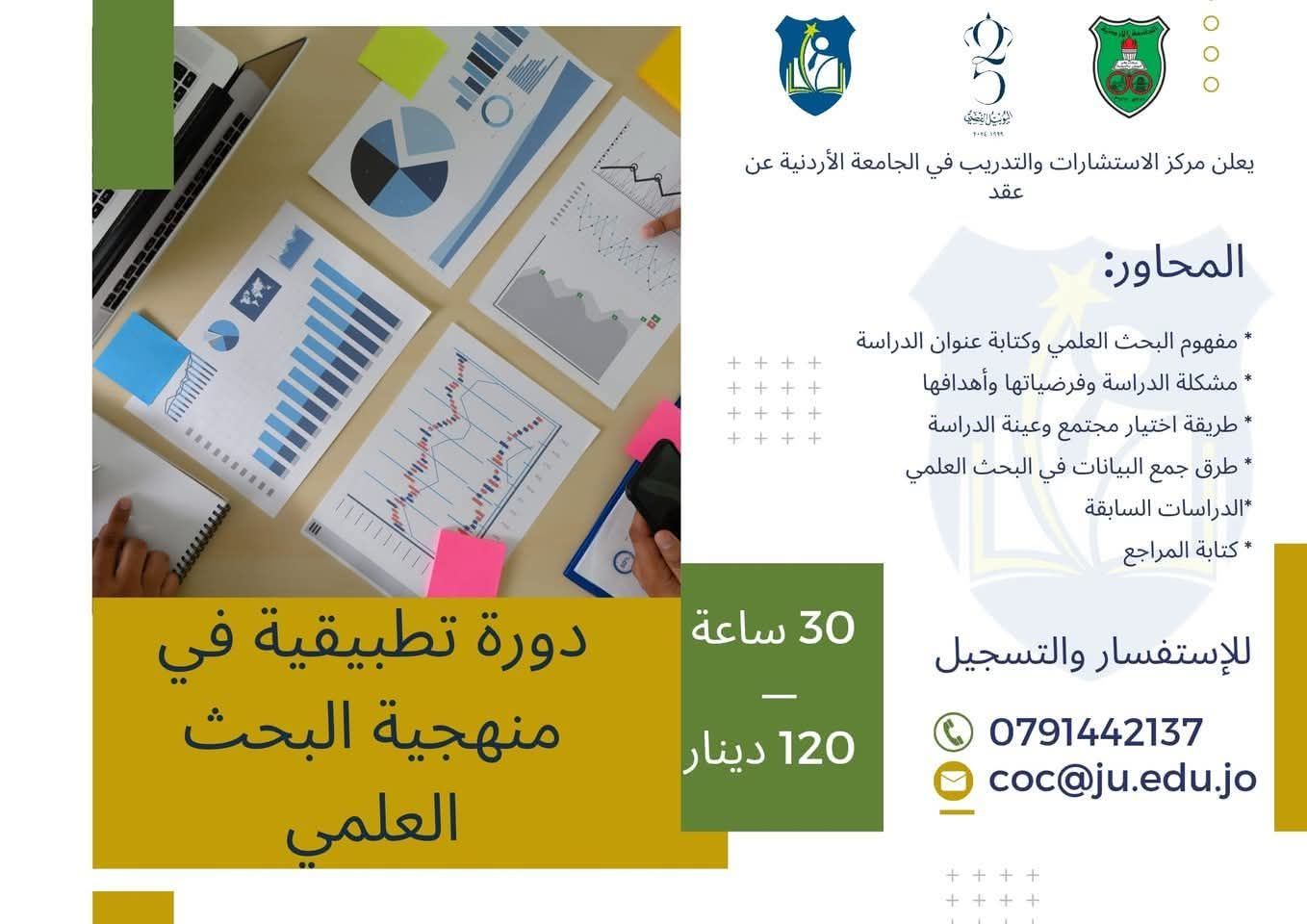 يعلن مركز الاستشارات والتدريب في الجامعة الأردنية عن فتح باب التسجيل في "دورة تطبيقية في منهجية البحث العلمي"